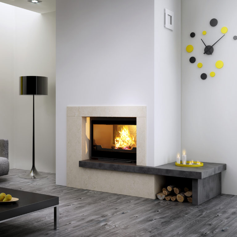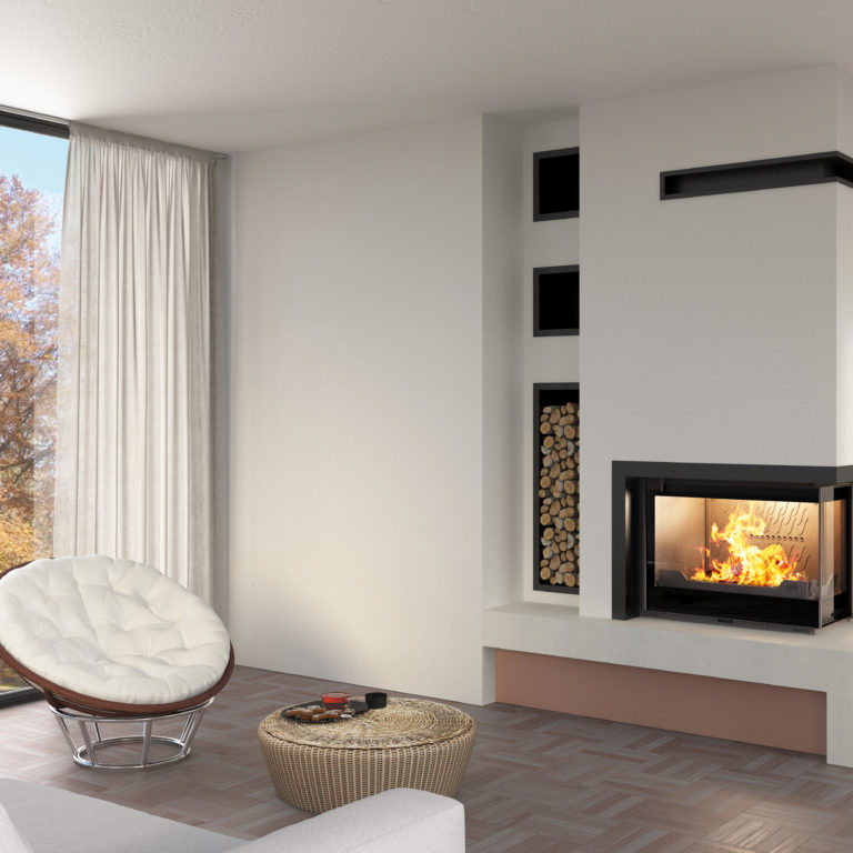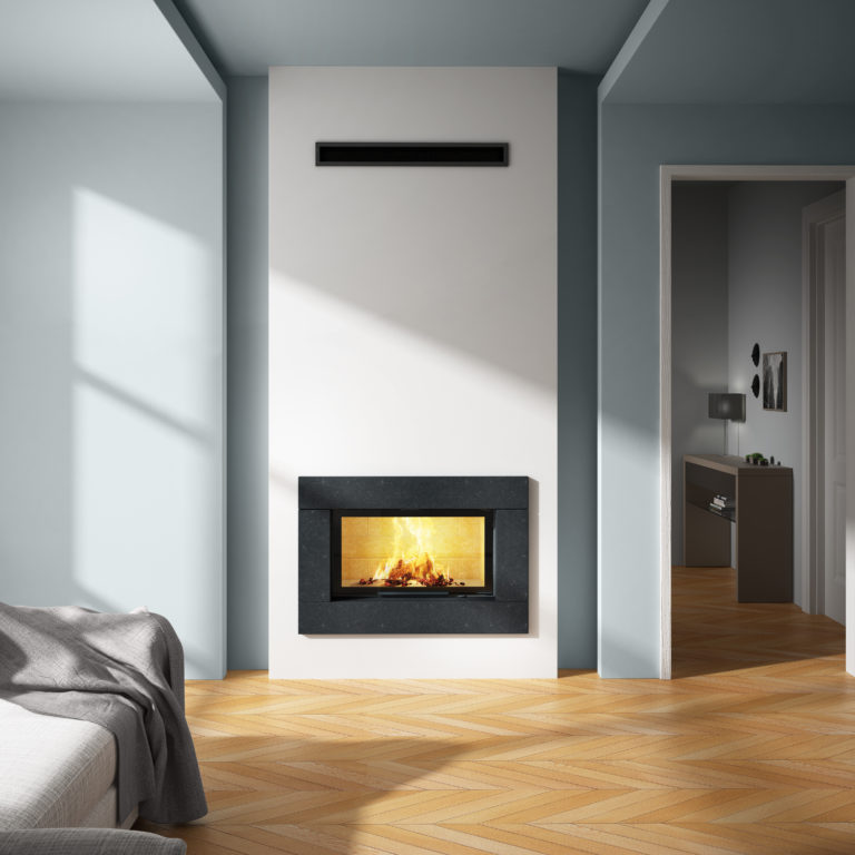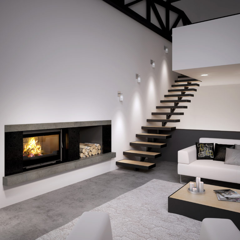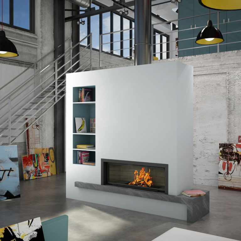 LAYLA III, Cheminée de face en coffrage. Cadre métallique monobloc…