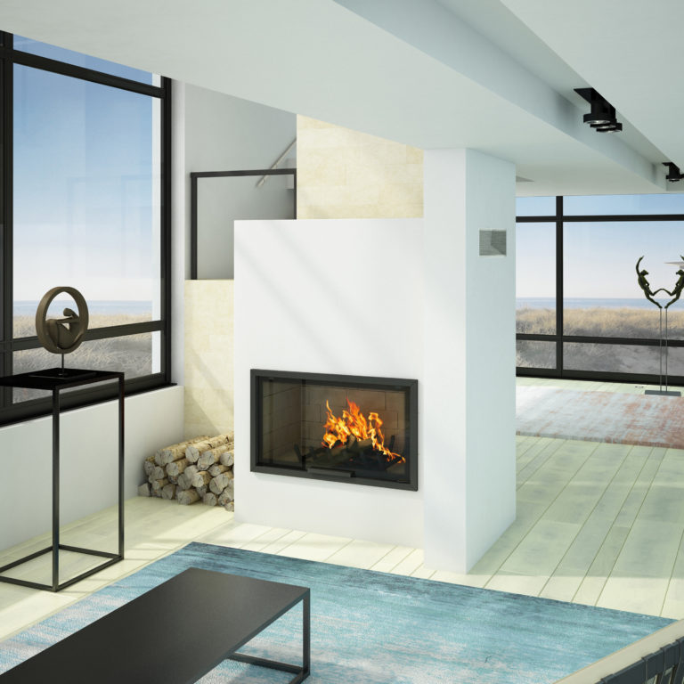 Cheminée de face en coffrage. C’est la cheminée qui offre une large vision …