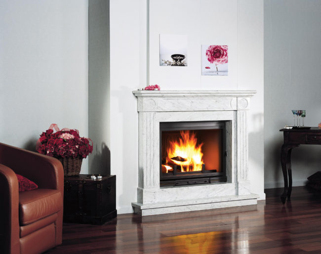 CHEVERNY, Cheminée de face en marbre de Carrare. Modèle…